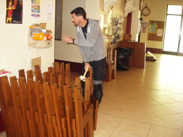 Ce chantier, qui aura duré moins d’une semaine, a permis de supprimer l’ensemble des chaises en paille qui étaient principalement centenaires. Le Conseil Paroissial pour les Affaires Économiques, voyant que les chaises s’abîmaient de plus en plus, a sondé les paroissiens pour savoir ce qu’ils préféraient entre des chaises et des bancs pour remplacer les actuelles places assises.